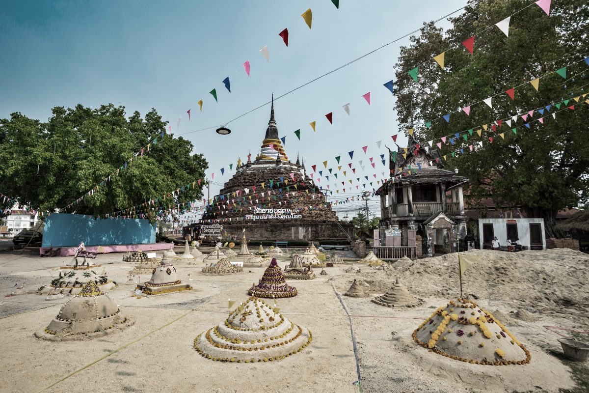 Viele Menschen beginnen Songkran mit einem Tempelbesuch. Dort spenden sie Essen, reinigen Buddha-Statuen und bauen kleine Sand-Stupas (Chedi Sai) auf dem Tempelgelände – ein symbolischer Akt des Zurückgebens und der inneren Erneuerung.
