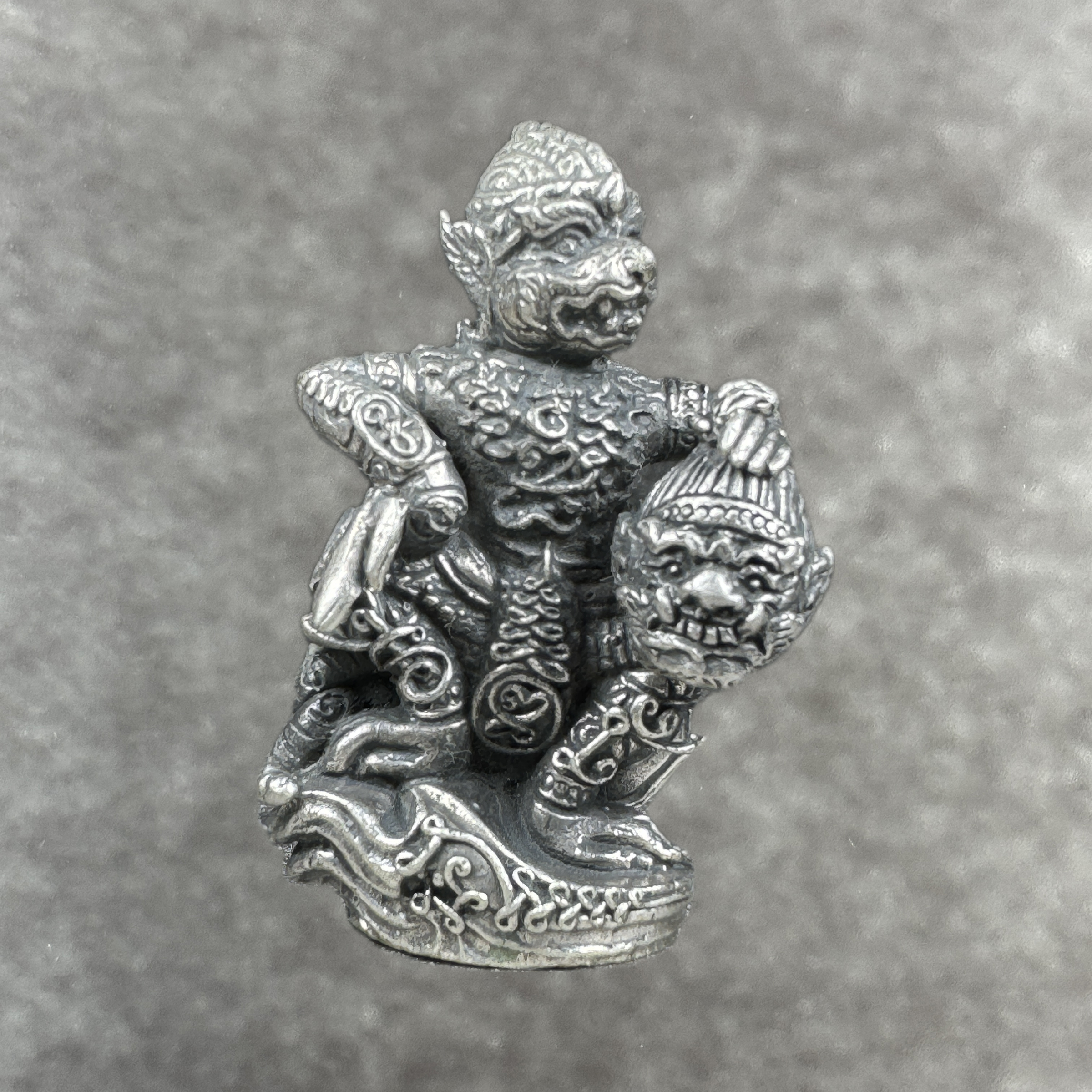 Dieses besondere Amulett stammt aus der berühmten „Khiaw Kaew Prakarsit“-Serie von Luang Pho Kalong (Wat Khao Laem). Es zeigt den Affengott Hanuman im Moment seines Sieges über den Dämonenfürsten Kumphan – ein Bild für den Triumph des Guten über das Böse.