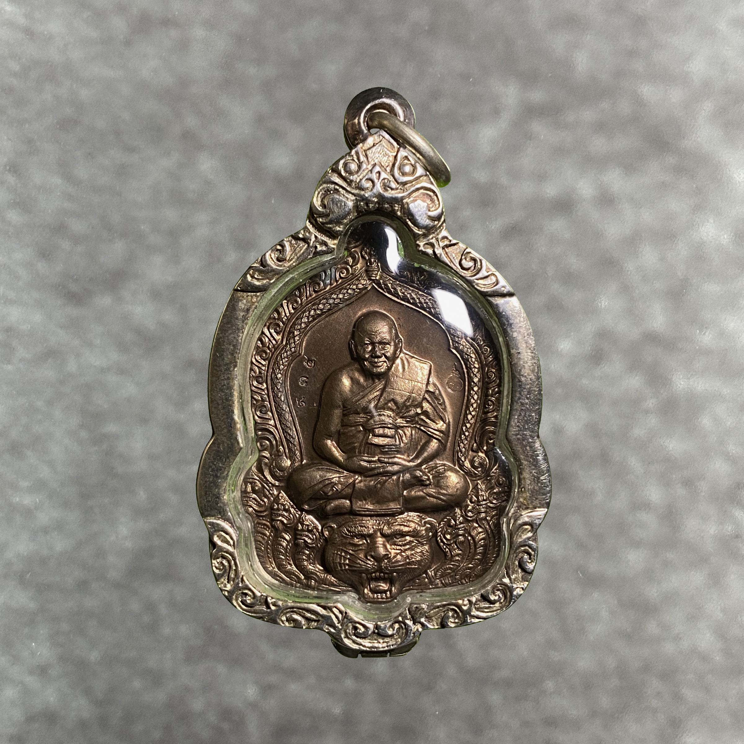 Gefertigt wurde dieses Exemplar in Nuea Nawa Loha, einer hochgeschätzten Legierung aus neun Metallen, darunter Gold, Silber und Kupfer, teilweise mit seltenen Beimischungen wie Quecksilber. Nawa zählt neben Edelmetallen zu den begehrtesten Materialien für Sammler. Von dieser Variante wurden nur 975 Stück hergestellt – eine extrem geringe Auflage, die dieses Amulett heute schwer erhältlich und besonders wertvoll macht.