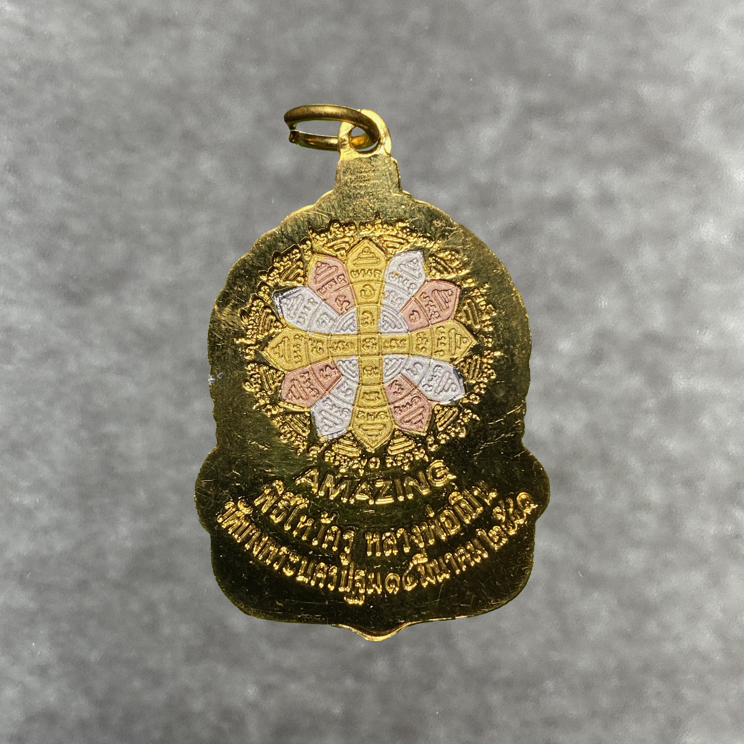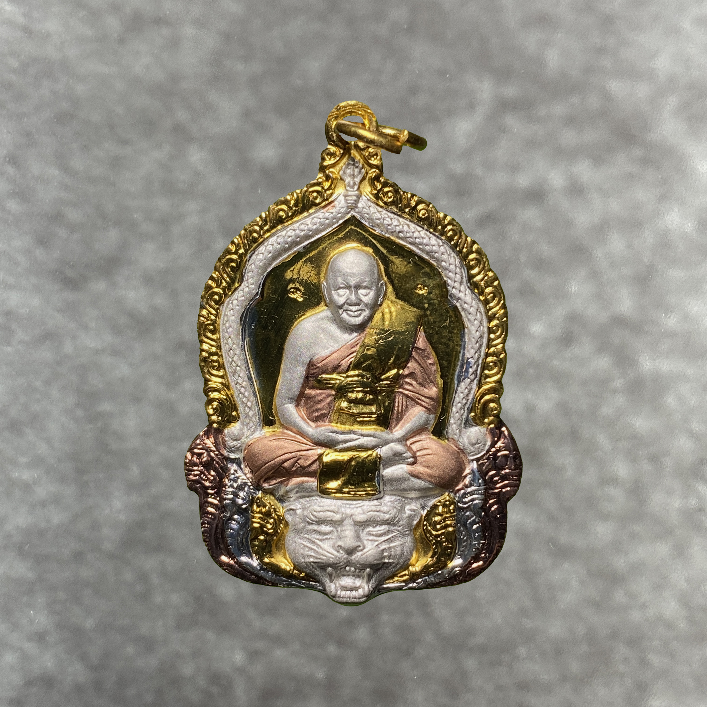 Gefertigt wurde dieses Exemplar ursprünglich in Kupfer (Thong Daeng – „rotes Gold“, der thailändische Ausdruck für Kupfer) und anschließend mit einer besonderen dreifarbigen Veredelung (Sam Gasat = „drei Könige“: Gold, Silber und Kupfer) versehen. Dadurch erhält das Amulett seinen besonderen Glanz.